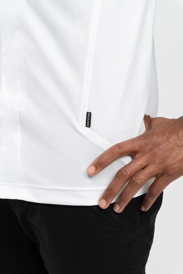 4) Inserti simmetrici e dorso in maglia doubleface per respirabilità e comfort ottimali, lato esterno in poliestere, lato interno in cotone pettinato